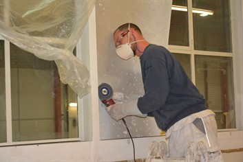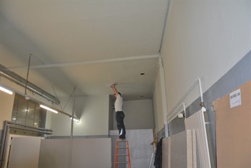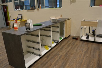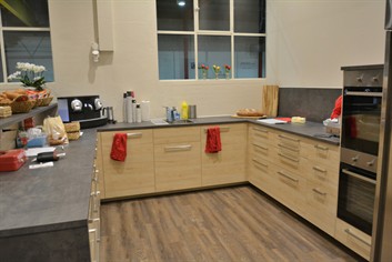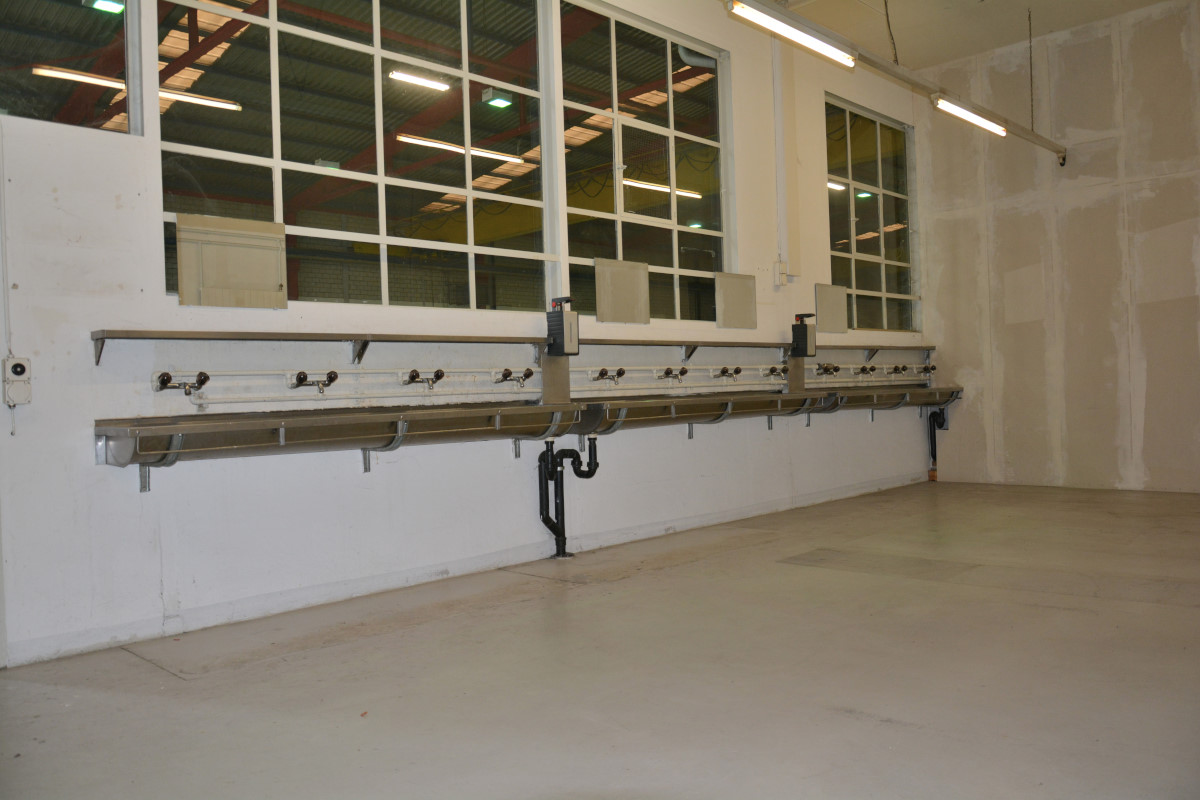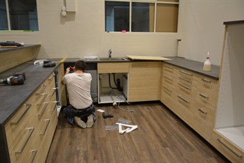 Waschrinnen und Garderobenschränke ausbauen und entsorgen; neue Türe in die Trennwand Richtung WC einbauen; Decke abhängen und alte Neonröhren durch Deckenspots ersetzen; Vinylboden verlegen, alles streichen; Einbau einer vollwertigen Küche mit Buffet und allen Geräten und Kühlschränken.