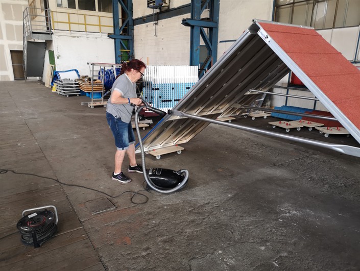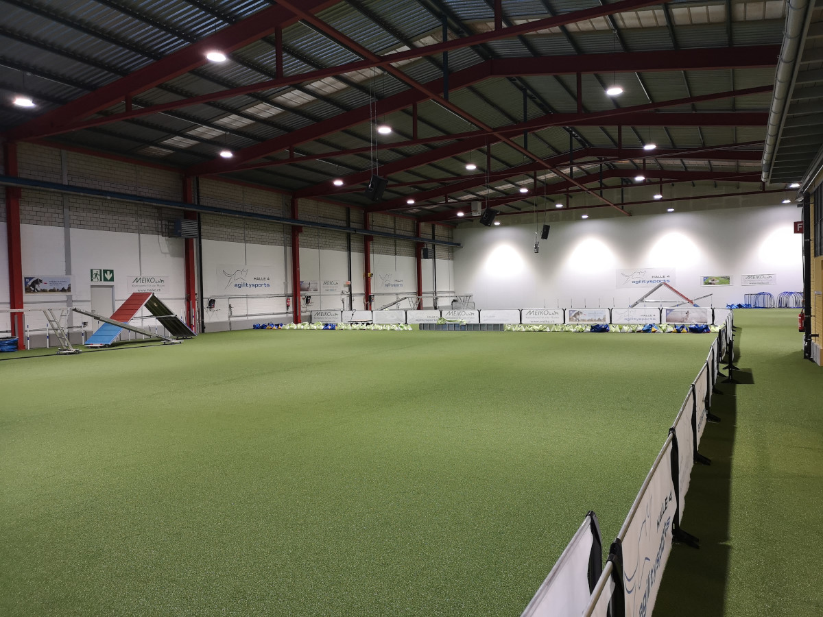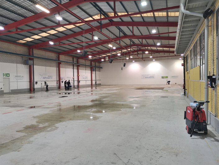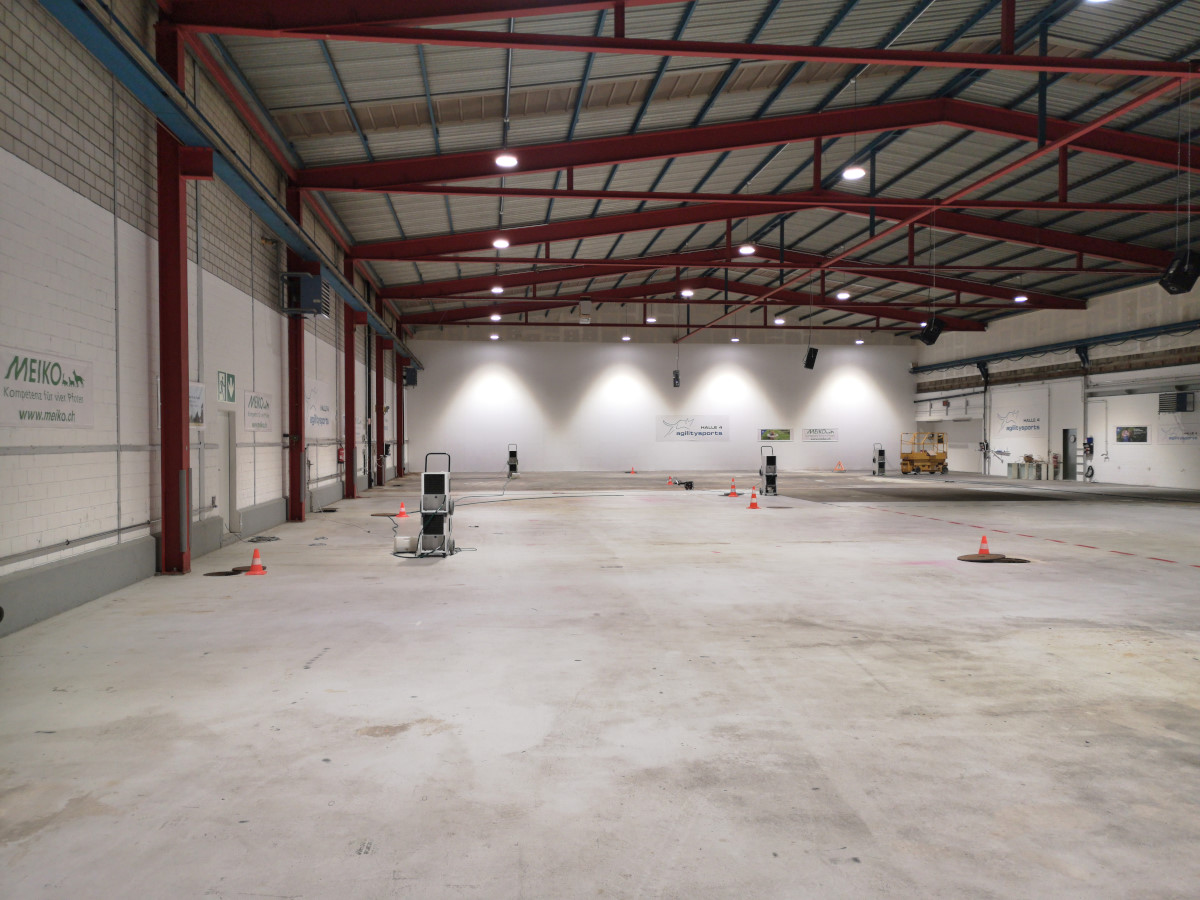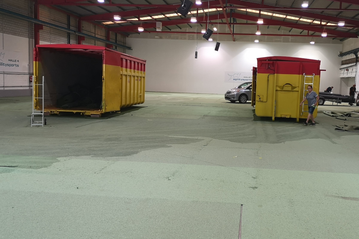Nach den Aufräumungs- und Entsorgungsarbeiten folgt eine Phase der Austrocknung des Betonbodens. Da für die Lieferung des neuen Kunstrasens Lieferfristen bestehen, kommt in der hinteren Hallenhälfte ab Mitte September für rund vier Wochen ein temporär verlegter Kunstrasen als Provisorium zum Einsatz.